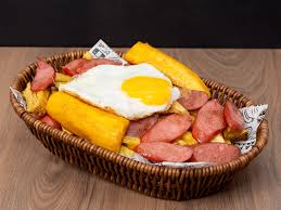 Disfruta una irresistible salchipapa a lo pobre, que fusiona lo mejor de la tradición criolla con el sabor callejero. Sobre una generosa cama de papas fritas crujientes se sirven salchichas doradas, huevo frito con yema suave y plátano frito que aporta un toque dulce y contrastante. Acompañada de salsas especiales, es un plato abundante, lleno de sabor y perfecto para los que buscan una experiencia contundente y sabrosa.