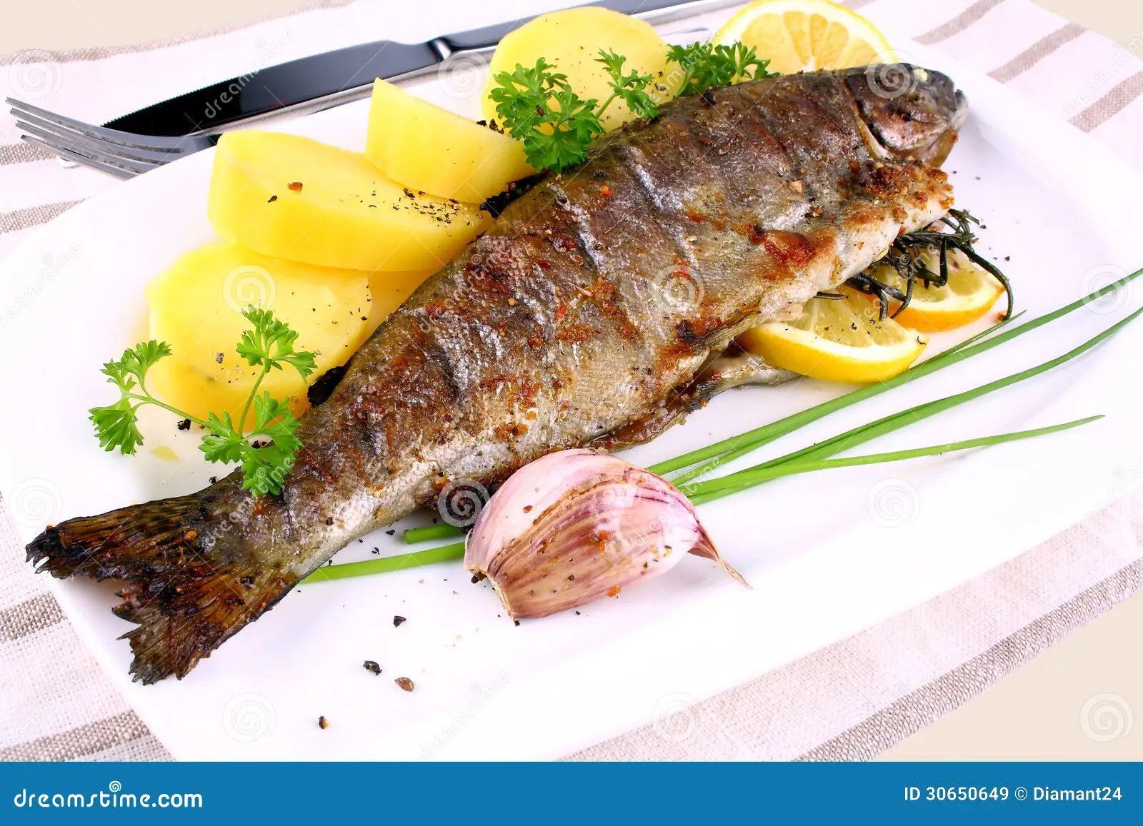 Trucha fresca dorada a la parrilla, jugosa y con un toque ahumado.